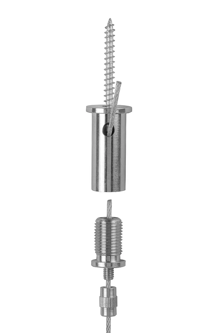 Een 1,5 mm staalkabel ophangset met verstelbare snelle plafondbevestiging en aan het uiteinde een lus voor het ophangen van buizen, panelen en andere objecten. De staalkabel is vanuit de plafondbevestiging in hoogte verstelbaar.