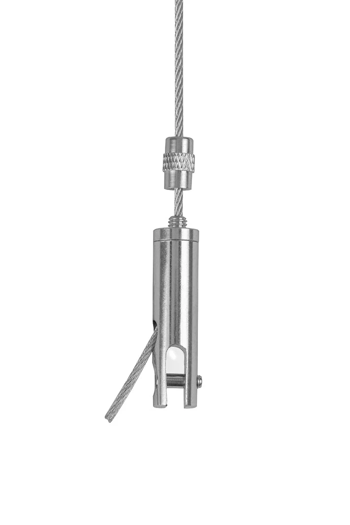 Een 1,5 mm staalkabel ophangset met lus en aan het uiteinde een paneelhanger voor het ophangen van reclame, routeaanduiding en andere panelen tot max. 4 mm dik. Deze set is in hoogte verstelbaar en geschikt voor het ophangen van panelen vervaardigd uit dibond, forex, triplex, aluminium en hout. De lusbevestiging heeft een vaste maat.
